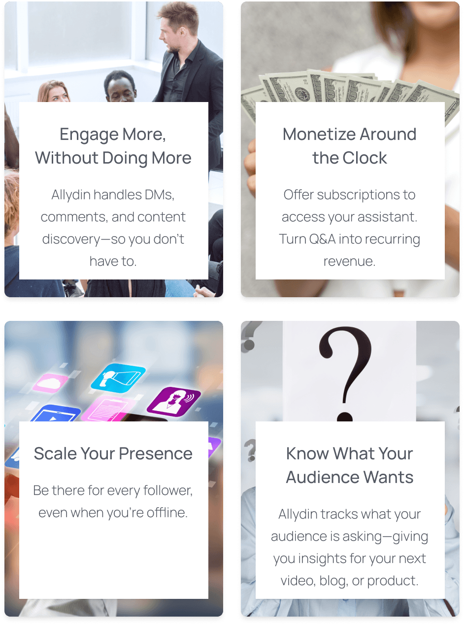 Allydin transforms your content into an AI-powered assistant that speaks like you, answers your audience’s questions, and helps them discover exactly what they need—anytime, in any language.